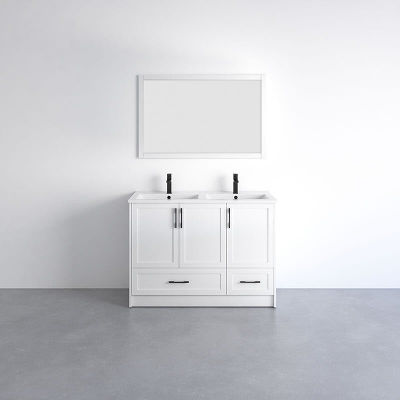 Freestanding Wood Vanity with White Ceramic top.